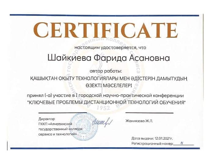 Shaikieva Farida Asanovna, teacher of the highest category of the Kazakh language and literature of our college, took part in the scientific-practical conference “Topical issues of development of technologies and methods of distance learning”, organized by the Almaty State Service and Technological College and was awarded a diploma. certificate of authorship. The work is included in a special collection. Congratulations!