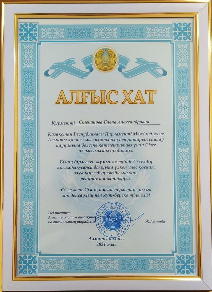 For active participation in the polling station of the deputies of the Mazhilis of the Parliament of the Republic of Kazakhstan and the Maslikhat of Almaty, Deputy Director for educational and production work Stepanova E.A. and teacher of special disciplines of the highest category Mametsupiev A.A. were awarded a letter of apprecition!