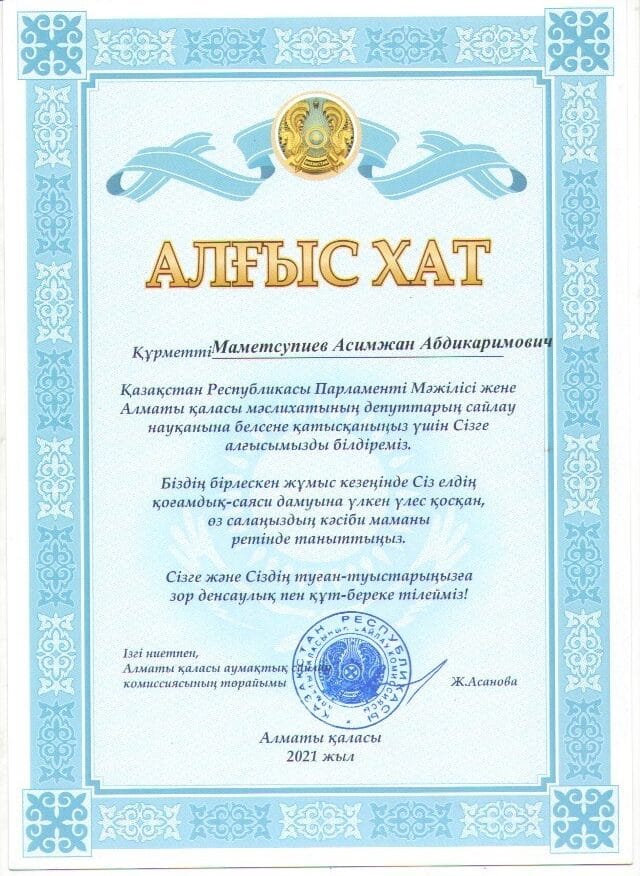 Қазақстан Республикасы Парламенті Мәжілісі және Алматы қаласы мәслихатының депутаттарының сайлау науқанына белсене қатысқаны үшін директордың оқу-өндірістік ісі жөніндегі орынбасары Степанова Е.А. және жоғары санатты арнайы пән оқытушысы Маметсупиев А.А алғыс хатпен марапатталды!