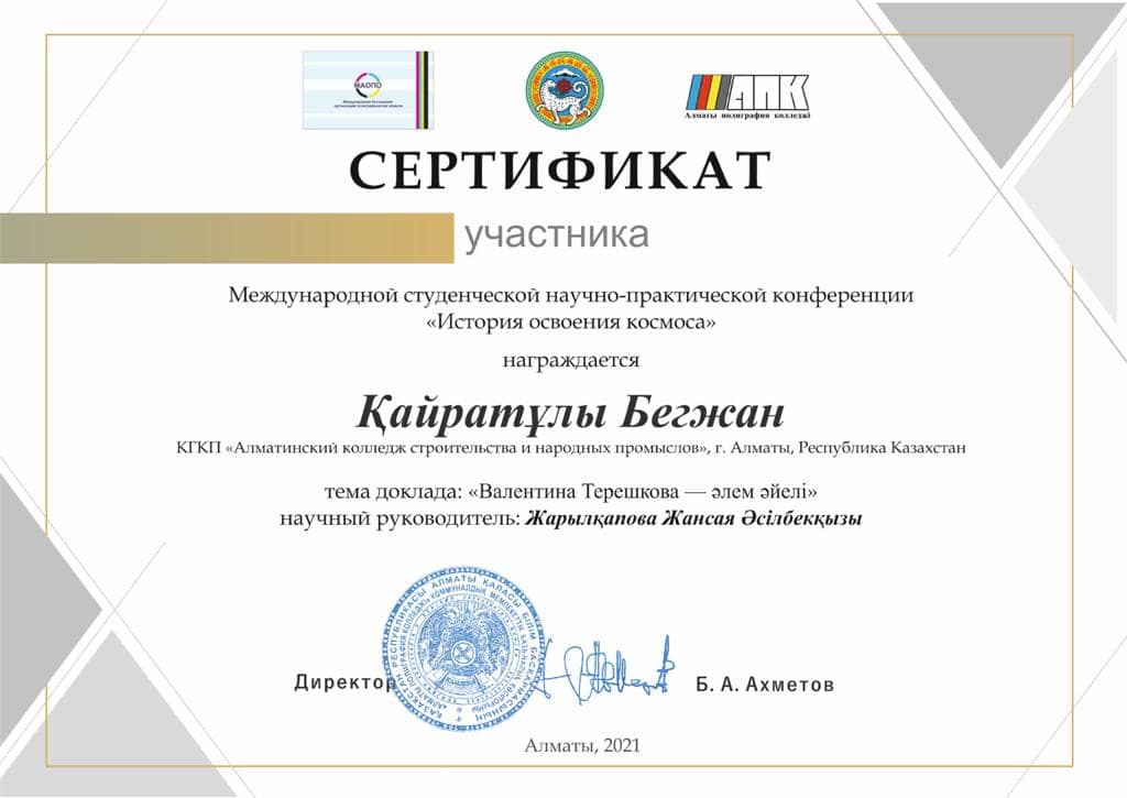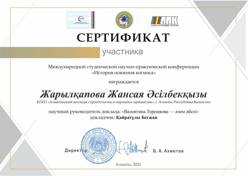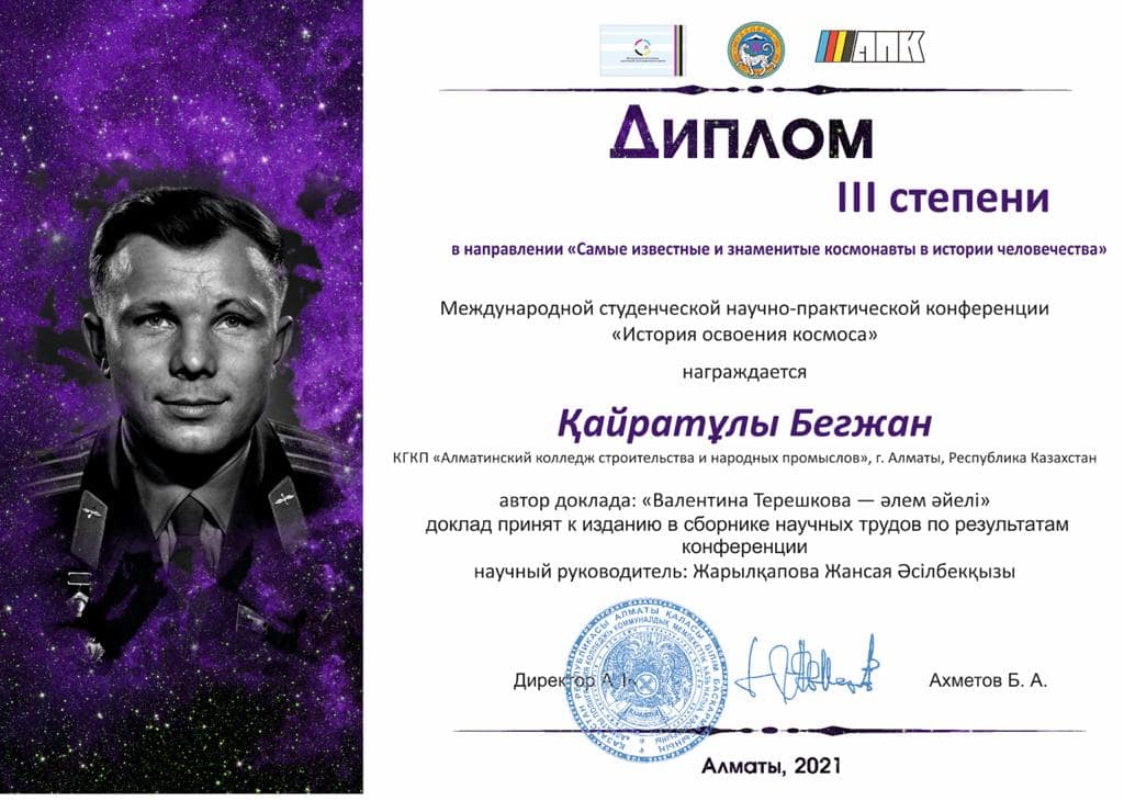 Адамзаттың ғарышты игеруіне 60 жыл толуына орай Алматы полиграфия колледжінің ұйымдастыруымен «Ғарышты игеру тарихы» атты Халықаралық студенттік ғылыми-практикалық конференцияға Алматы құрылыс және халықтық кәсіпшілік колледжінің 1 курс 20-01 топ студентті Қайратұлы Бегжан қатысып ІІІ Дәрежелі дипломмен марапатталды. Баяндама тақырыбы: «Адамзат тарихындағы ең танымал және әйгілі ғарышкерлер» секциясы бойынша «Валентина Терашкова –әлем әйелі». Ғылыми жетекшісі: Жарылқапова Жансая Әсілбекқызы.