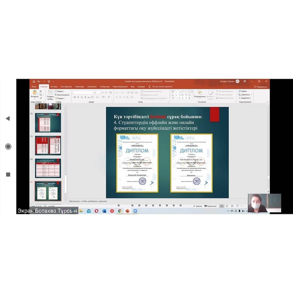 07.04.2021 ж. күні 20-07,20-09 топтарында Онлайн ата – аналар жиналысы өтті. Тақырыбы: “студенттердің қашықтықтан оқыту жағдайларына бейімделуі” 1) 2020 -2021 оқу жылының 1 жарты жылдығы бойынша үлгерімінің қорытындысы. 2) сабаққа қатысуы жағдайы . 3) студенттердің ағымдағы үлгерімі туралы. 4) құқықбұзушылықтың алдын-алу. 5)әртүрлі сұрақтар қарастырылды.