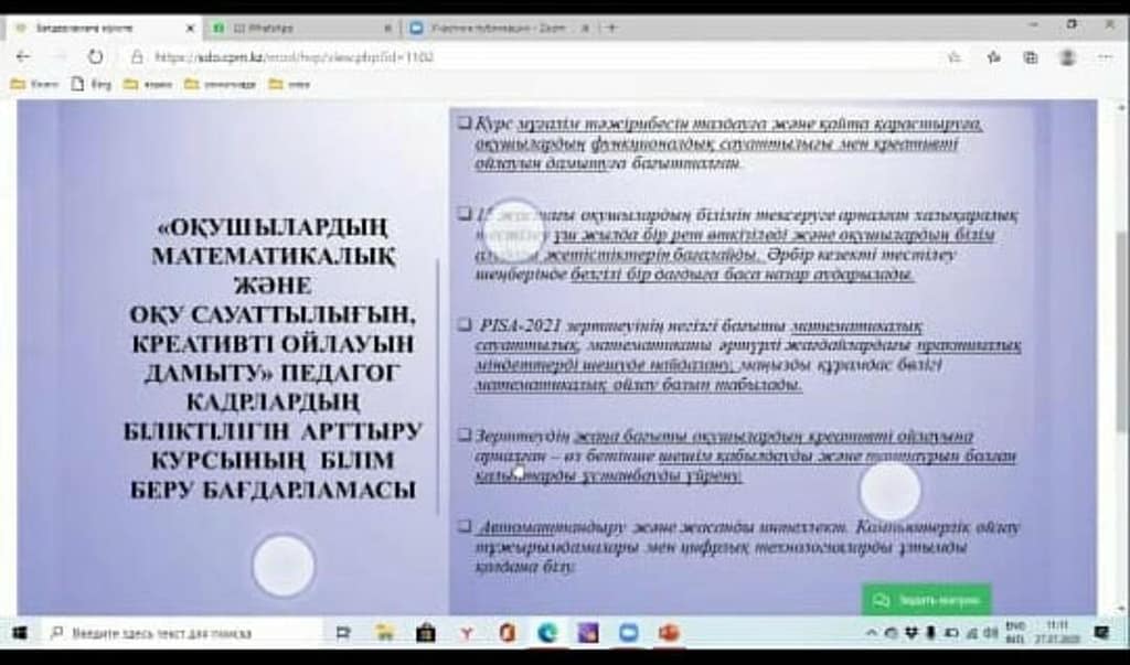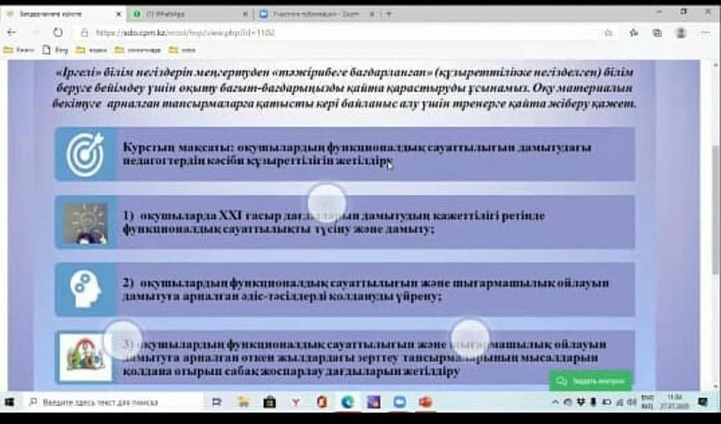 27.07-04.08.20ж. аралығында Алматы құрылыс және халықтық кәсіпшілік колледжінің жоғары санатты математика пәнінің оқытушысы Жұбаниязова Айдынкүл Жұбайқызы математика пәні бойынша жаңартылған мазмұндағы оқу бағдарламасына сәйкес қысқа мерзімді сабақ жоспарын әзірлеу бойынша, педагогикалық шеберлік орталығының ұйымдастыруымен онлайн желісі арқылы zoom, google қосымшалары арқылы курстан өтуде. Бағдарлама тренері- Батанова Жанар Жумабековна.