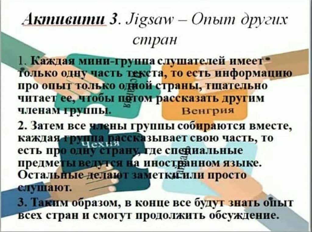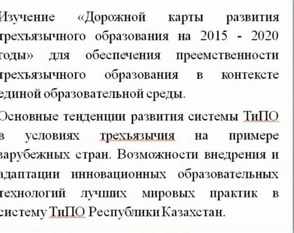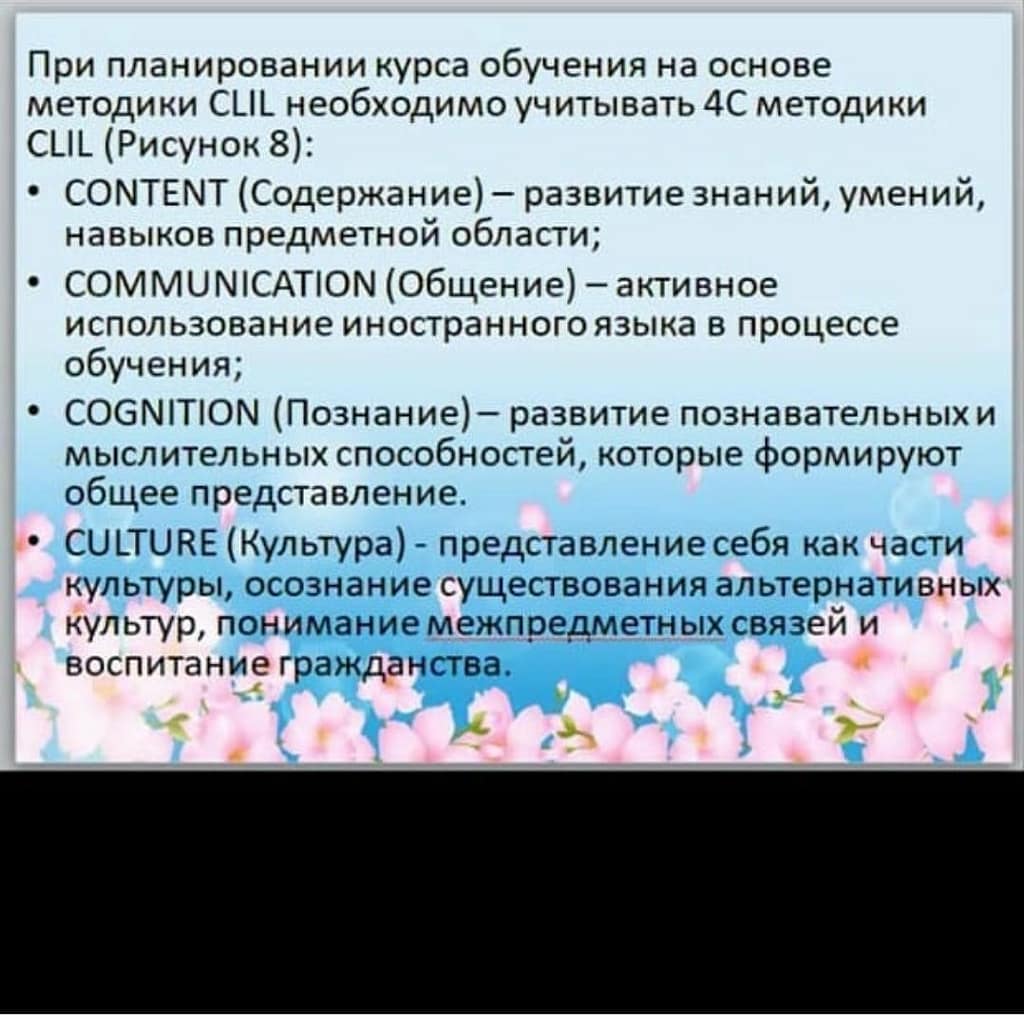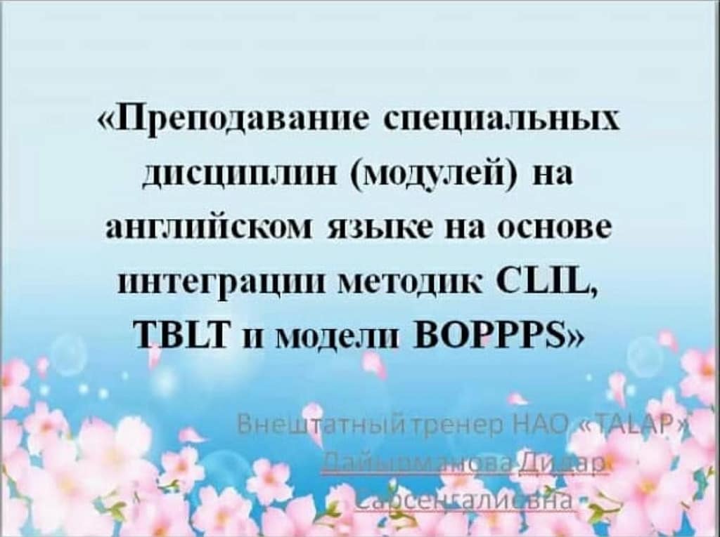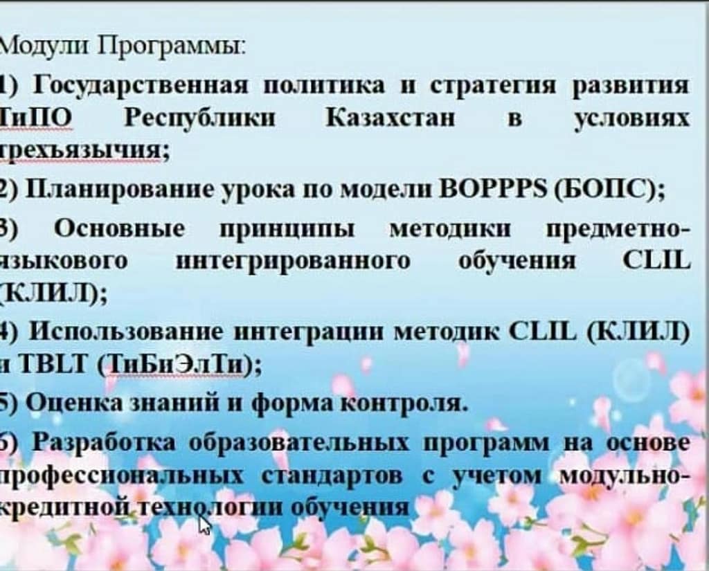 В свою очередь вопросы перехода системы ТиПО на интегрированное обучение предмету и языку активно реализовывается НАО «Talap». С целью приобретения знаний, умений и навыков по применению методики CLIL на занятиях. Тренер курса –Дайырманова Дидар Сарсенгалиевна.