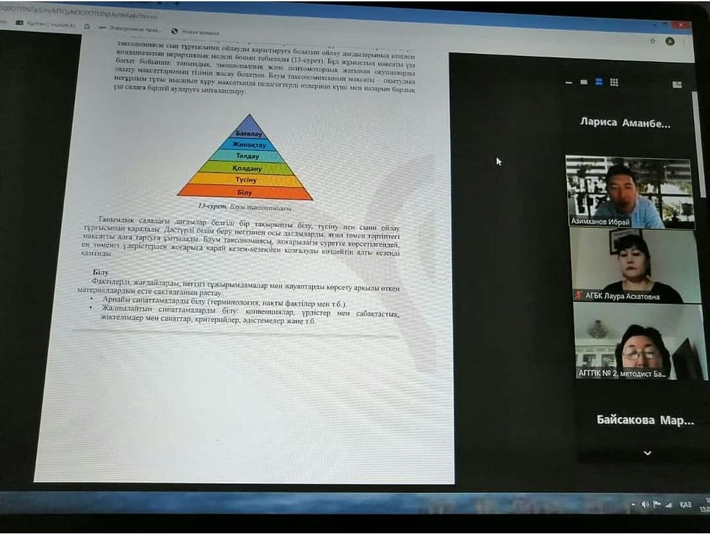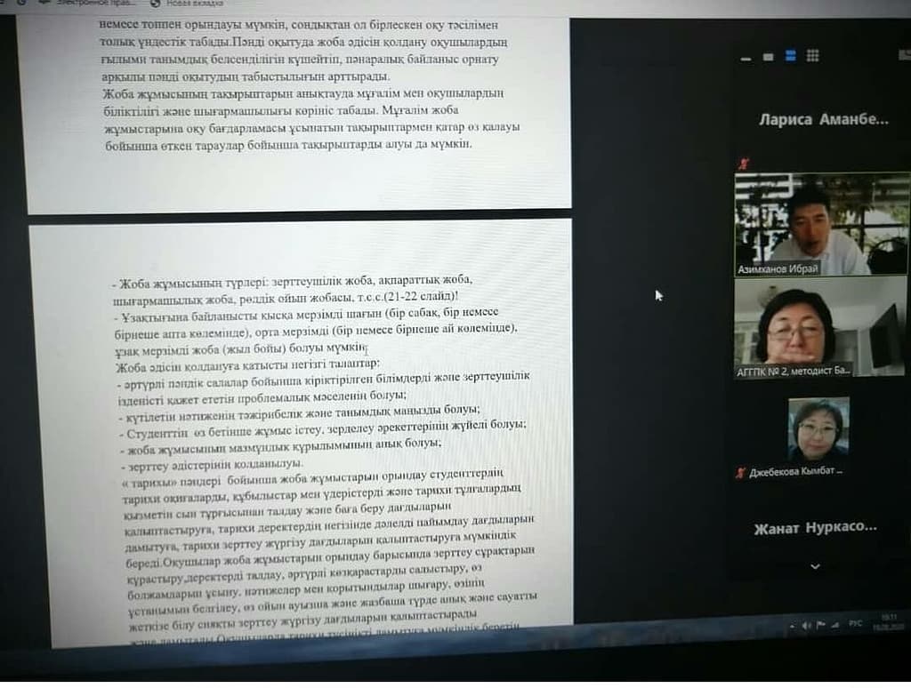 На вебинарах педагоги рассуждали о том, что такое критическое мышление и его ключевые особенности, навыки критического мышления, определяли какова роль преподавателя в дифференциации обучения, продемонстрировали практическую значимость и преимущества критериального оценивания, выявили чем отличаются обновлённые учебные программы по истории, обсудили особенности развития исследовательских навыков студентов на уроках истории. Рефлексирование на занятиях осуществляется в решении специальных групповых заданий. Ежедневно педагоги получают задания для самостоятельной работы с целью применения, анализа, синтеза и оценивания рассмотренных тем.