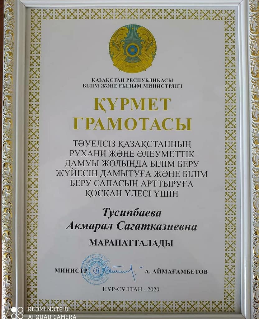 Методист Алматинского колледжа строительства и народных промыслов Тусипбаева Акмарал Сагатказиевна была награждена «Почетной грамотой» Министерства образования и науки РК за вклад в развитие системы образования и повышение качества образования во имя духовного и социального развития независимого Казахстана. Поздравляем!