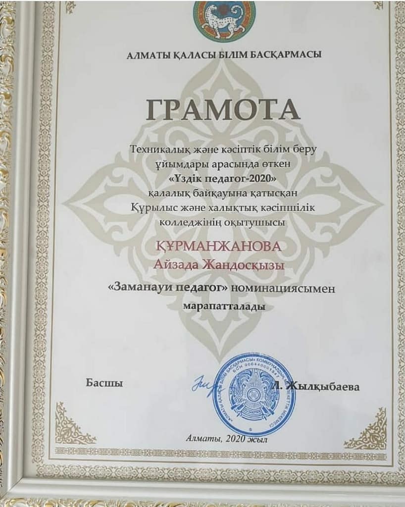В конкурсе «Лучший педагог-2020» молодой специалист, преподаватель специальных дисциплин Алматинского колледжа строительства и народных промыслов, Курманжанова Айзада Жандосовна зарекомендовала себя с хороший стороны. Она отличился своим мастерством и выиграла номинацию «Современный педагог».