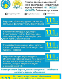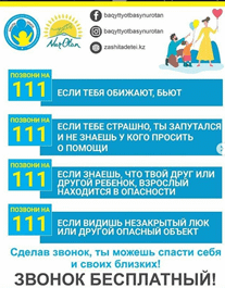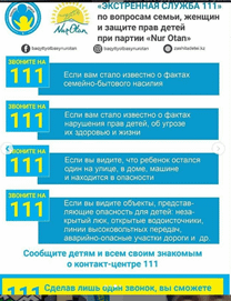 Уважаемые родители и студенты! По вопросам семьи, защиты прав женщин и прав детей просим обращаться в партии “Nur Otan”. В бесплатный контакт-центр экстренной службы 111. Сделав звонок, вы можете спасти себя и своих близких. 9 ОКТЯБРЯ 2020 Г.