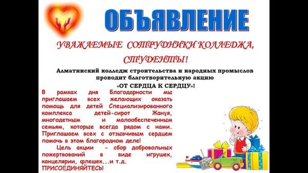 Алматинский колледж строительства и народных промыслов проводит благотворительную акцию «ОТ СЕРДЦА К СЕРДЦУ»!В рамках дня Благодарности мы приглашаем всех желающих оказать помощь для детей Специализированного комплекса детей-сирот Жанұя, многодетным и малообеспеченным семьям, которые всегда рядом с нами. Приглашаем всех с отзывчивым сердцем помочь в этом благородном деле! Цель акции – сбор добровольных пожертвований в виде игрушек, канцелярии, флешек…и т.д.