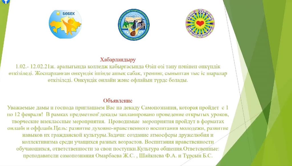 Ответсвенные: преподаватели самопознания Омарбаева Ж.С. , Шайкиева Ф.А. и Тұрсын Б.С.