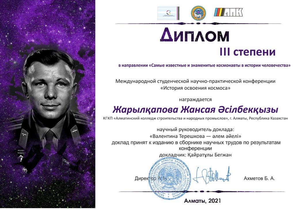 Бегжан Кайратович, студент 1 курса Алматинского колледжа строительства и народных промыслов, принял участие в Международной студенческой научно-практической конференции «История освоения космоса», организованной Алматинским полиграфическим колледжем по случаю 60-летия освоения космоса человеком. награжден дипломом III степени. Тема доклада: «Валентина Терашкова – жена мира» в разделе «Самые известные и знаменитые космонавты в истории человечества». Научный руководитель: Жарылкапова Жансая Асильбековна.