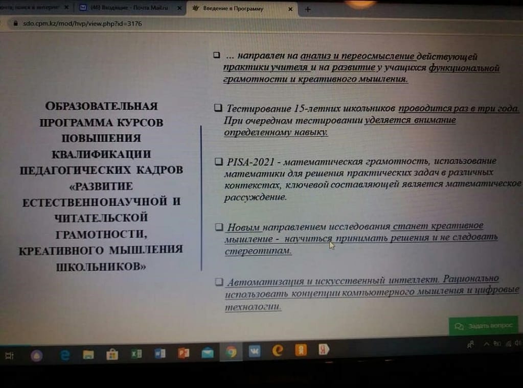 Бағдарламаның мақсаты: Оқушылардың функционалдық сауаттылығын дамытудағы педагогтердің кәсіби құзыреттілігін жетілдіру. Оқушылардың функционалдық сауаттылығын және шығармашылық ойлауын дамытуға арналған әдіс- тәсілдерді қолдануды үйрену, креативті ойлауды дамыту. Ұйымдастырушы: директордың ОӘІЖ орынбасары Омишова А.Н., әдіскер: Тусипбаева А.С.